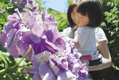 中山駅南口からほどなくの所にある四季の森プロムナード(=写真)でも、紫色や赤紫色の花が沿道に彩りを添えていた。今月3日、近所から紫陽花を愛でにきたという篠原友香さん親子は「出産後初めて紫陽花を見に来た。とてもキレイ。今後はここをお散歩ルートにしたいと思う」と話していた。