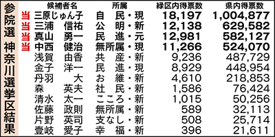 参議院議員選挙の投開票が7月10日に行われた。4議席を12人が争った神奈川選挙区では、自民党の現職・三原じゅん子氏(51)が約100万票を獲得し、トップ当選を果たした。三原氏は緑区でも他を圧倒した。