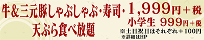 まぐろ、サーモン、海老、つぶ貝など、豊富な11種類のネタと新鮮な肉が一度に味わえるしゃぶしゃぶ・にぎり寿司食べ放題コースは税別1999円〜(小学生税別999円〜)。8月31日までは天ぷらも食べ放題。