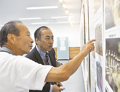 長津田の初代領主・岡野家の子孫とされる岡野進さんが9月28日、緑区役所を訪れ開催中の歴史展を鑑賞した。初代領主の次男を先祖に持つ進さんの訪緑は、岡野家にまつわる歴史展を行ってきたいぶき野在住の歴史愛好家の久保田武光さんの熱意で実現した。