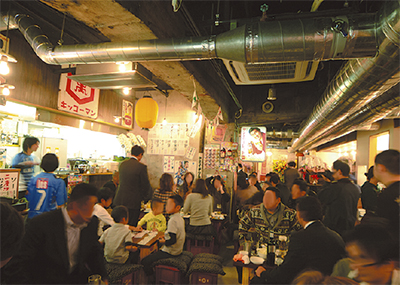 夜ともなると会社帰りのサラリーマンや地元住民など多くの面々が店にやってくる。各店は工夫を凝らした一品料理をリーズナブルに提供。地下空間はたちまち活気に満ち溢れる。