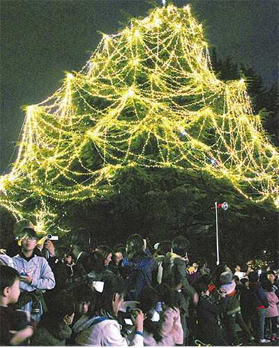 点灯式では石田秀夫副院長が「地域の皆様のお陰で、点灯式も今年で4年目となった。皆様に愛される街のシンボルツリーとなれば」と挨拶。点灯カウントダウンの後、電球に光がともると、会場は拍手に包まれた。