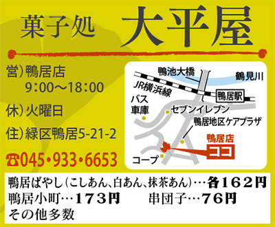 定番の和菓子だけでなく、地域の名を冠したオリジナル銘菓「鴨居ばやし」や「鴨居の糸」「鴨居小町」を取り揃え、毎日のおやつやご進物、祝事の添え物など多彩な場面に華を添えている。同店は50年前に川崎の大平屋から暖簾分けして誕生。40年前に現在の場所に店舗を構えた。