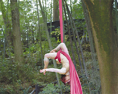 当日は草木に囲まれた森の中で、特殊な布や専用の道具を使い空中パフォーマンスをする「エアリアル」や、パントマイムなどが森のサーカス音楽団の演奏に合わせて披露される。出演者は長谷川愛実さん(エアリアルアーティスト)、バーバラ村田さん(マイム&フィジカルアーティスト)、ALKさん(ポールダンス、エアリアルアーティスト)。