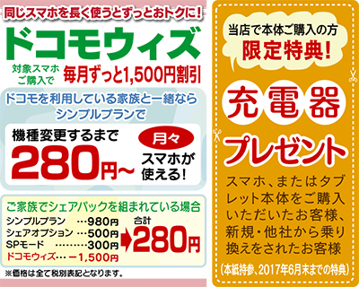 2つ目は、初心者でも操作しやすい対象2機種のいずれかを購入すると、月々の料金から毎月1500円割引になる「ドコモウィズ」。