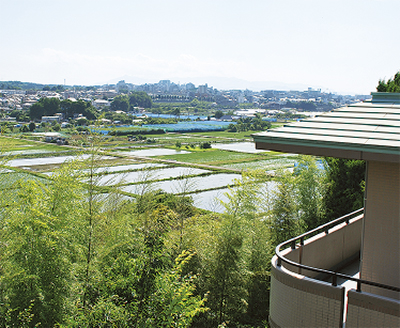 施設名の通り北八朔町に構える同施設。目の前には田園風景が広がり、緑豊かな住環境も入居者から好評を博している。入居者のSさんは「自然が多くて、過ごしやすいです」と話す。