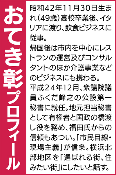 福田峰之衆議院議員の秘書として緑区内の地域の声と接してきたおてき彰が考える「市民目線の優しい政治」。市民の代弁者である議員は、街の声を拾い、具現化することが役割です。あの都議選に旋風を起こした都民ファーストの会もよこはま自民党の政策集を参考にするほど、よこはま自民党は議会改革が進んでいます。改革の火を消さないためにも内部で声を上げる必要があります。