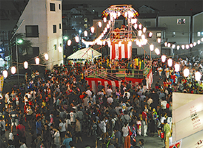 中山商店街協同組合(奥津守理事長)による盆踊り大会が先月31日、同商店街の第一駐車場を会場に行われた=写真。