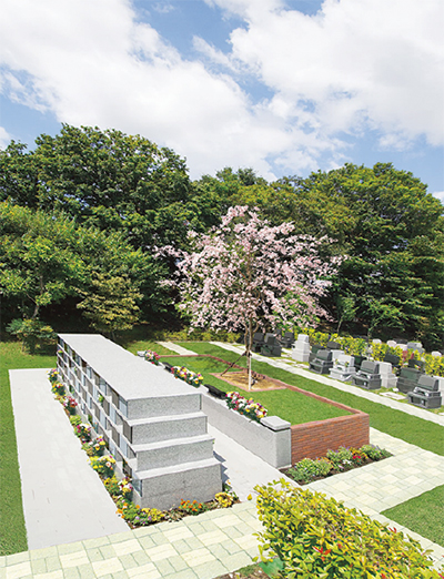 自然葬の一つとして注目を集める”樹木葬”も同園では人気の供養方法の一つ。「自然に還る」ことで良い印象を持つ人も多い樹木葬だが、施設によってその対応方法は様々。同園では、しだれ桜を墓標に見立て、遺骨を集合散骨区画に埋葬する樹木葬集合墓が15万で利用できる(管理費込)。