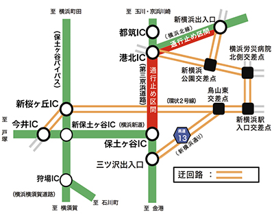 同時に首都高速・横浜北線の新横浜入口〜横浜港北JCT間の下り線通行止めと新横浜入口の上下線閉鎖も実施される(図参照)。
