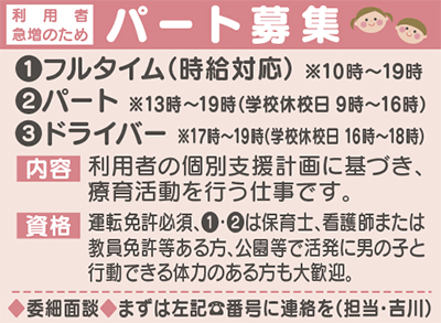 昨年11月に開所した吉川武志代表は自身の子どもが県立みどり養護学校に通う「父親の顔」も持つ。「自分と同じように子育てに悩んでいる人もいるので少しでも手助けになれば」との思いで開所に至った。