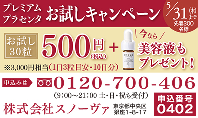 「そろそろ紫外線ケアをはじめたい」「シミやたるみが気になる」「季節の変わり目で肌が乾燥する」―― 。年齢を重ねるとともに、肌の悩みは増えるもの。そんな悩みにカラダの内側からアプローチする「飲むプラセンタ」が創業23年、銀座老舗エステサロン「スノーヴァ」から登場。