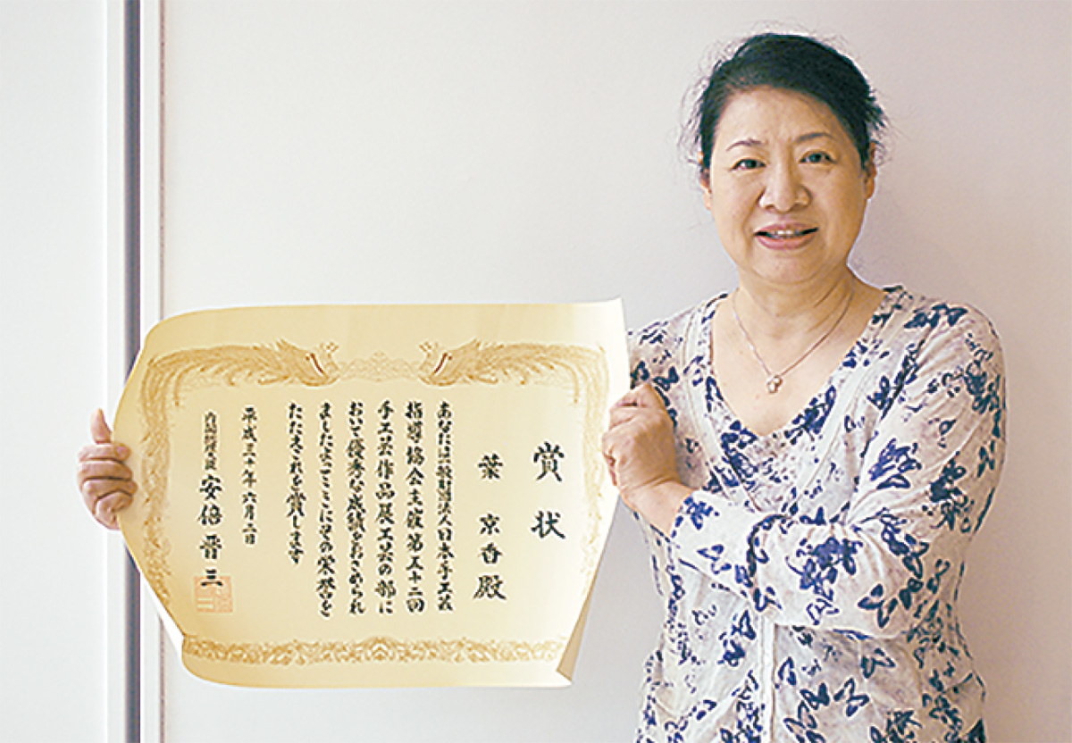緑区白山在住の葉(よう)京香さんがこのほど、「第52回手工芸作品展」(工芸の部)で、2年連続となる内閣総理大臣賞を受賞した。2年連続での最高賞受賞は同展開始以来、初めての快挙だという。