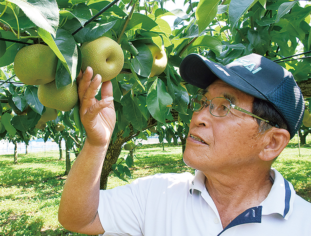 「浜なし」は、幸水、豊水、新水を主な品種として市内の認定果樹生産者団体の統一ブランド名。市場には出回らず、樹上で十分に完熟した大玉を庭先で直売している。