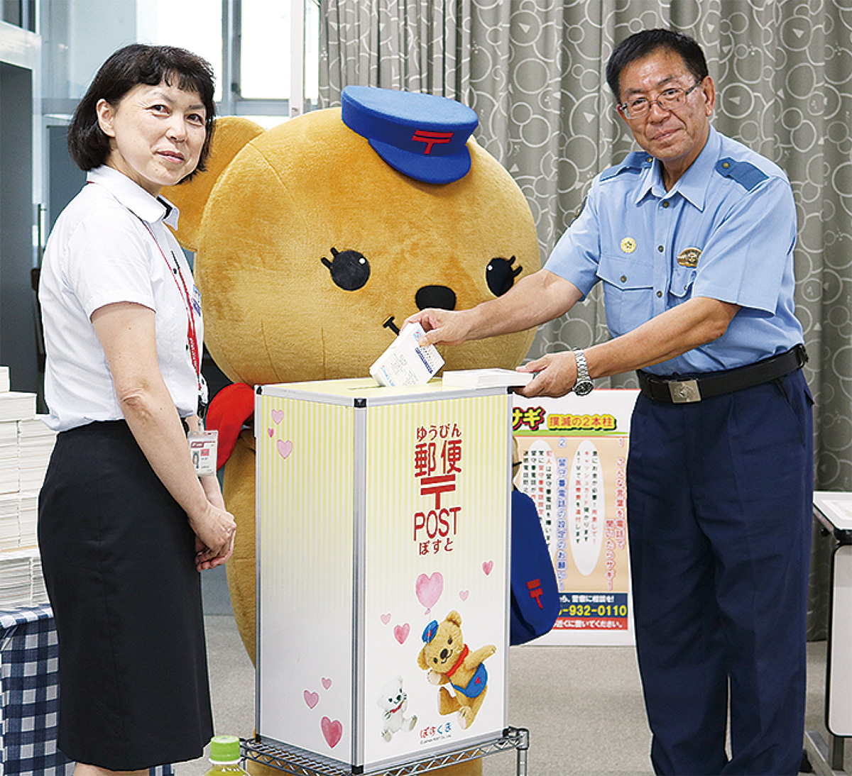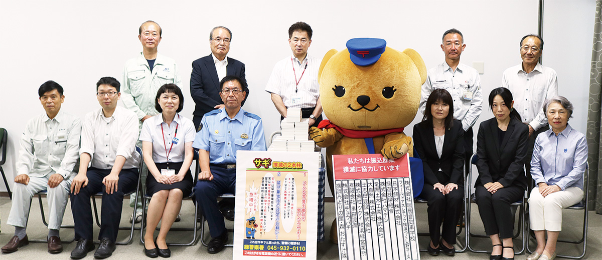 地元企業12社が協賛し、詐欺への注意喚起文言を記載した「かもめタウン」を約1万3000通作成。当日は、緑警察署の阿部篤署長に「かもめタウン」を贈呈後、小林順子緑郵便局長とともにポストへの投函式も行われていた。