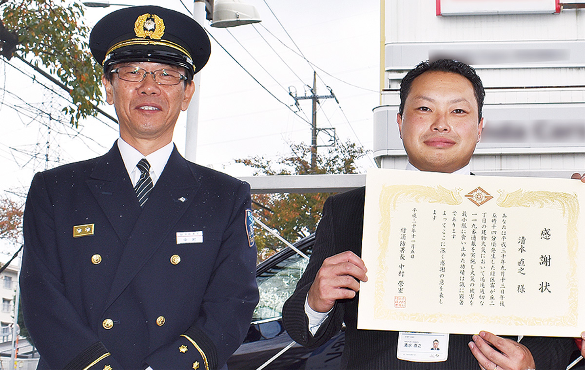区内霧が丘2丁目付近で9月に発生した火災に対して、緑消防署(中村榮宏署長)は、発見者の長瀬茜ちゃん(9)、消火活動を行った父の長瀬政憲さん、消防へ通報した清水直之さんに感謝状を贈呈した。