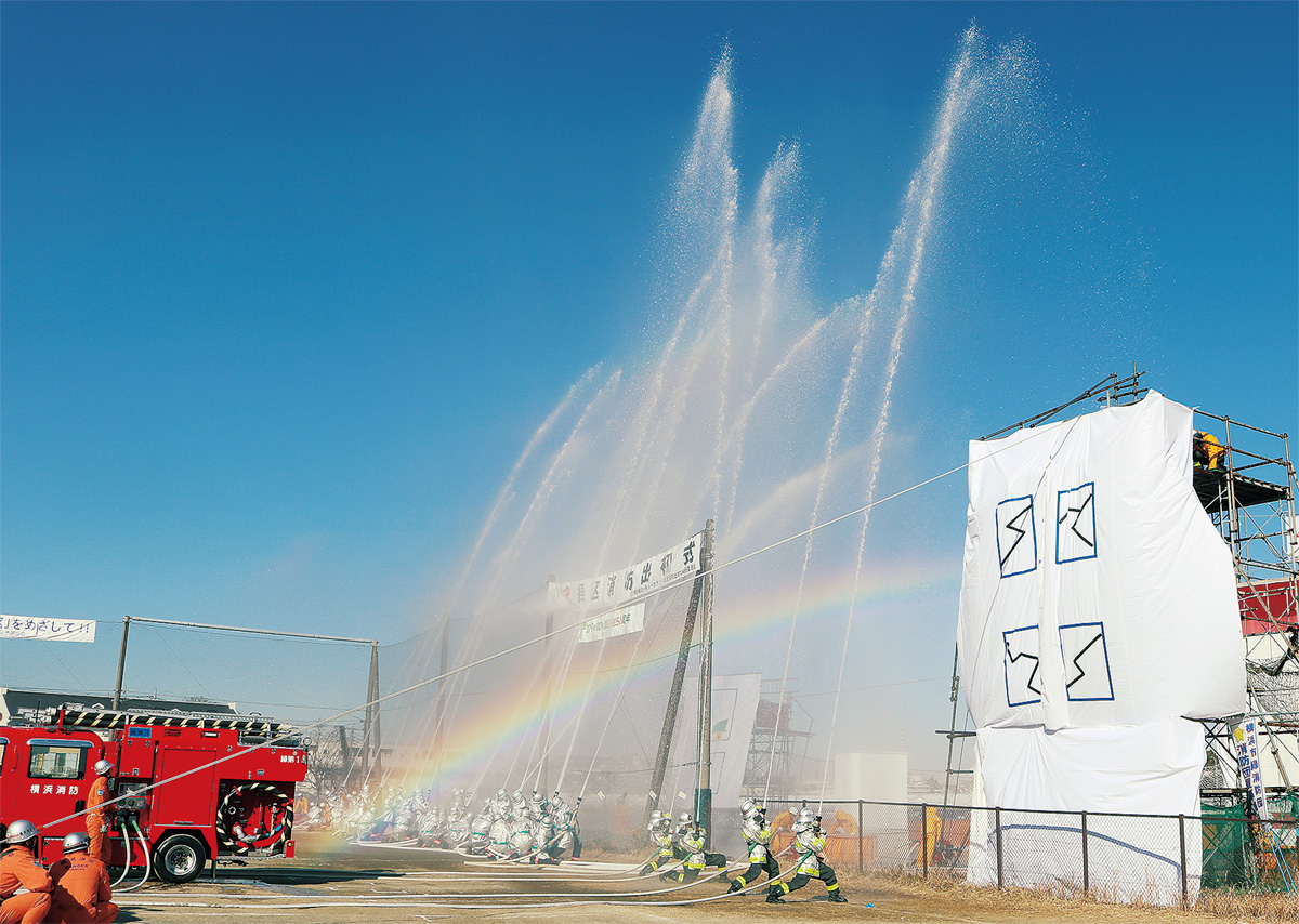 式典では、一般消防功労者と緑消防団員を表彰。その後、横浜市消防音楽隊ポートエンジェルス119によるステージドリルや車両分列行進、腕用ポンプ演技などが行われていた。最後の一斉放水では、多くの歓声があがっていた。