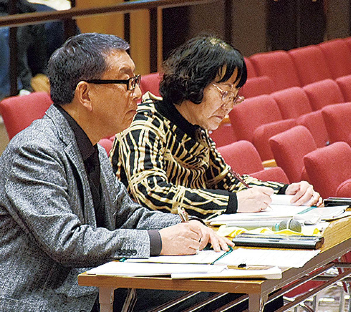 当日は、事前公募で集まった緑区在住・在勤の中学生ら44人が参加。会場に集まった参加者は緊張した面持ちで順番に審査曲の「信じる」「時の旅人」「Let‘s search for Tomorrow」を舞台上で合唱。今後の合唱指導も行う根本はるみ氏(緑が丘中学校合唱部顧問)と、山田茂氏(東京混声合唱団指揮者)が審査を担当した。