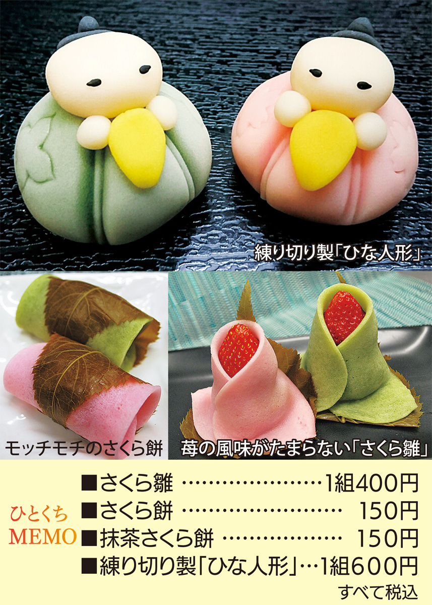 イチゴ好きには「さくら雛」が一押し。定番の「道明寺」なども、お花見シーズンに合わせてチェックしておきたい。