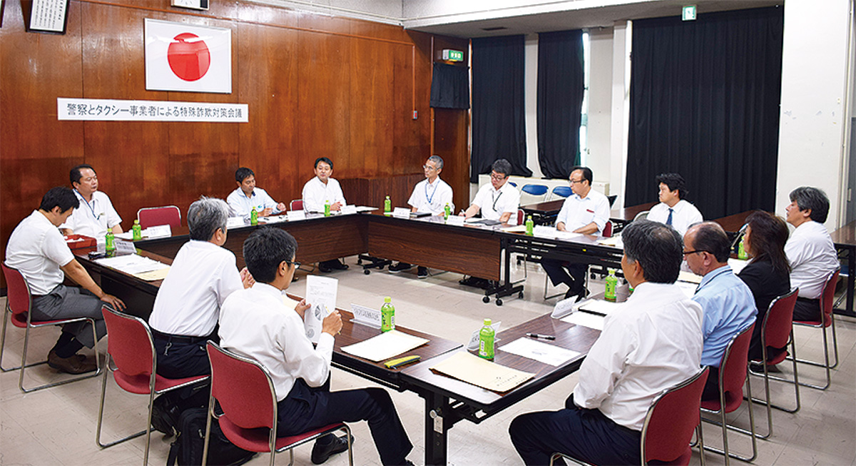 対策会議には、緑区内に本社や営業所を構える富士交通(有)・スタジアム交通(株)のほか、長津田・十日市場・中山・鴨居駅などに乗り入れる9社中6社が参加。冒頭であいさつに立った磯野署長は「直接被害者宅まで来てキャッシュカードなどをだまし取り、近くのATMで現金を引き落とす事例が多くなっている。犯人は地理に詳しくないためタクシーを利用します。犯人検挙のために各社と情報交換を密にしたい」と協力を求めた。その後は同署生活安全課や刑事課の捜査員らが県内や同署管内の発生状況や傾向を報告。それによると、今年緑署管内で発生している特殊詐欺の発生地区は東本郷(16%)、長津田(15%)、中山町(10%)に集中しており、鴨居(8%)、白山(同)、竹山(6%)と続いている。こうした状況について同署は「横浜線沿線で新横浜や町田などのターミナル駅から移動しやすい点が影響しているのではないか」と分析。また、直接現金を受け取る「受け子」の約3割が未成年の男性であるため「スーツ姿なのにピアスをしている」「タクシー内で携帯電話を使用し金の話をしている」などの不審な点があった場合に通報するよう呼び掛けていた。