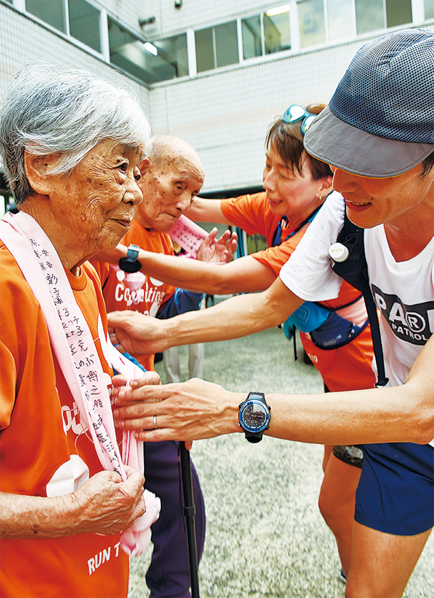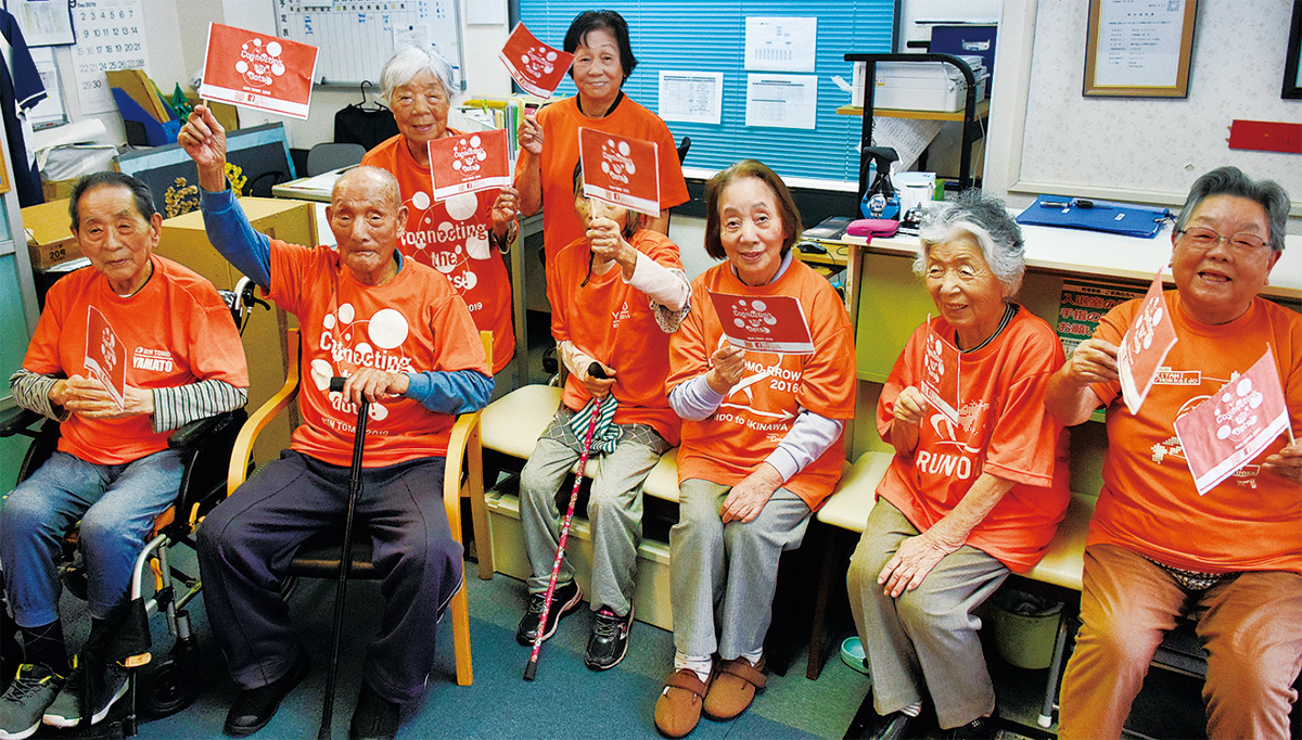 「デイサービスたのしーむ。十日市場」は、青葉区のたまプラーザ駅から襷を繋いできたコースの中継地点に。たのしーむでは同施設利用者で区内男性最高齢の池田久雄さん(106)と高崎てる子さん(94)が襷の到着を今か今かと待っていた。