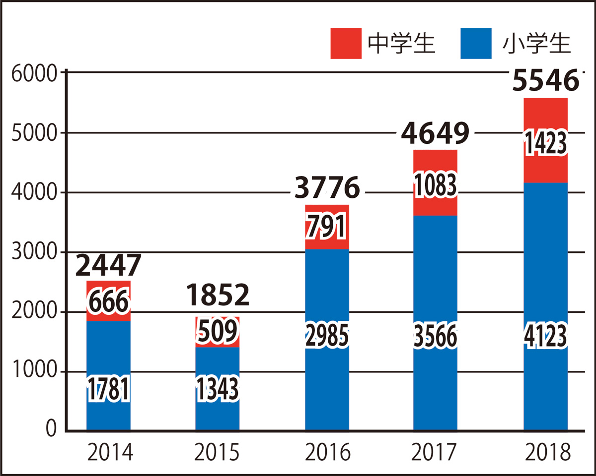 いじめの認知件数は小中学校ともに増加し、小学校では前年比557件(15・6%)増の4123件、中学校では前年比340件(31・4%)増の1423件だった。