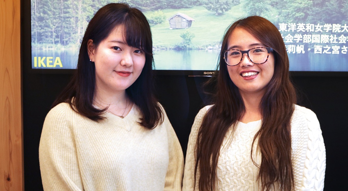イケア・ジャパン株式会社が提示した課題は、「より多くの人に、日々の暮らし、人生の中で、より持続可能な人にも地球にもポジティブな選択肢を選んでもらうためにどうすべきか」という環境課題テーマだった。同テーマに挑んだのは、国際社会学部2年生の横平莉帆さんと西之宮さくらさん。