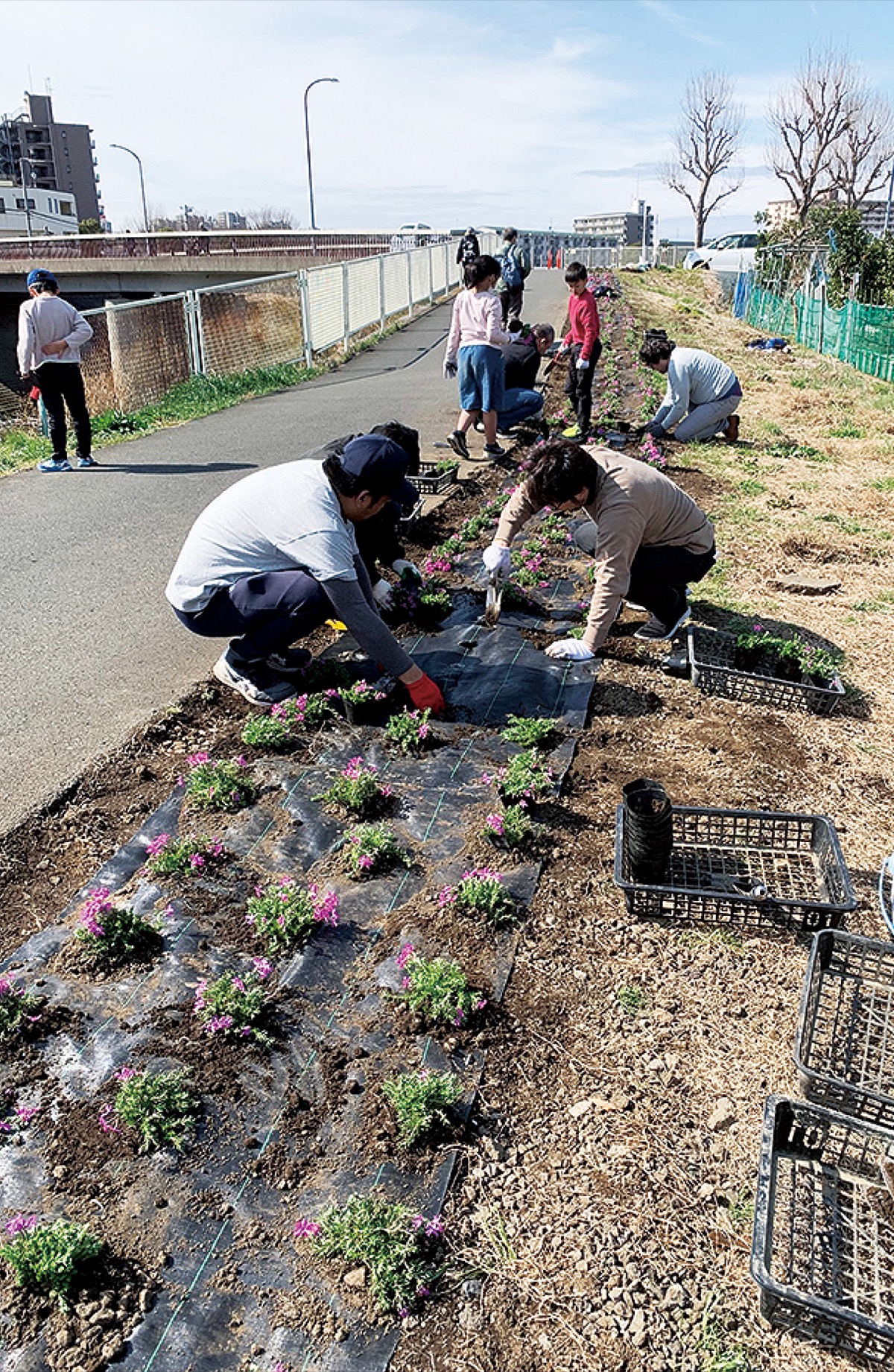 河川敷の美観維持などを目的に活動する『中小・上小おやじの会』はこのほど、恩田川沿い中山大橋付近の堤防(青砥町11の3番地先)で芝桜のポット苗300株を植栽した。