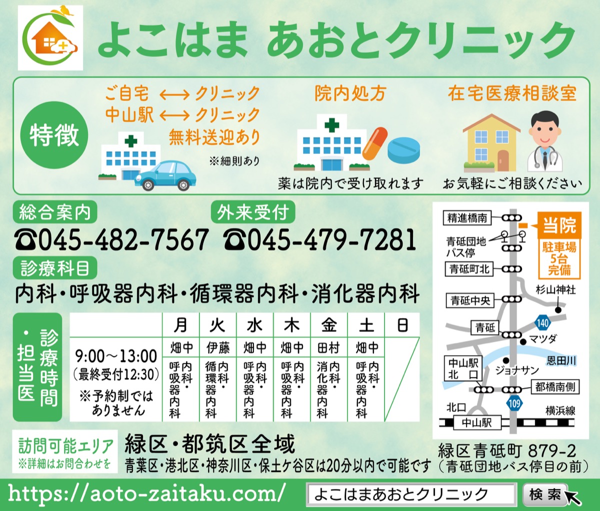 24時間365日対応の在宅医療と外来診療(月〜土の午前中)を行うクリニックとして新規開院した『よこはま あおとクリニック』。前身は2016年に開業した「あおと在宅医療クリニック」。現在は3人の常勤を含む8人の医師が在籍し、機能強化型在宅療養支援診療所に。また、畑中院長は緑区医師会在宅医療相談室リーダー医師も務める。「住み慣れた我が家でいつまでも自分らしく」という患者の思いを大切に、自宅での看取りや夜間・休日も緊急往診実績を重ねてきた。移転を機に本格的に外来診療がスタート。