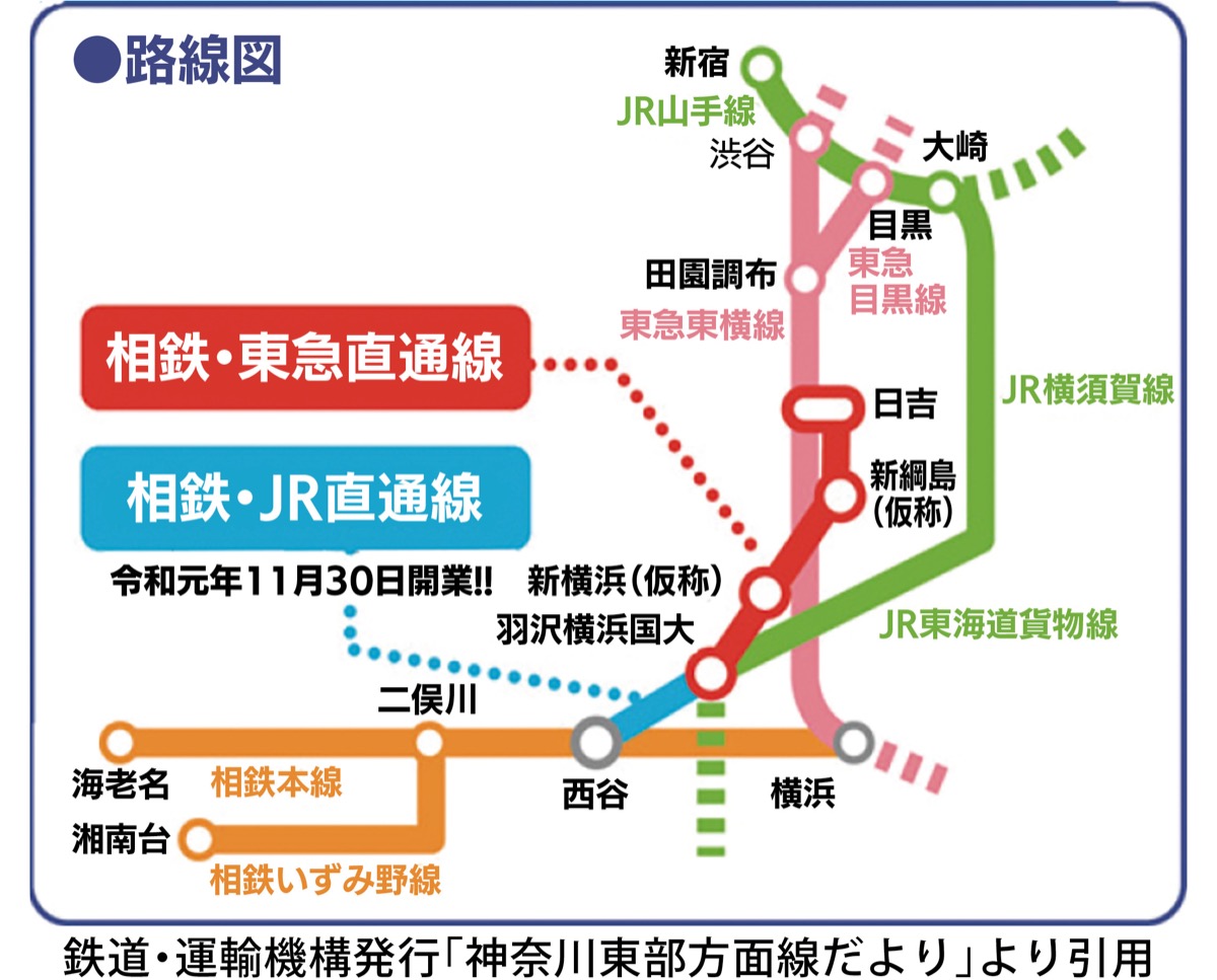 この路線は、昨年11月に開通した、相鉄・JR直通線の羽沢横浜国大駅から新横浜駅を経由し、東急東横線・目黒線日吉駅までの10Km区間で、相鉄線と東急線の相互直通運転が可能となる。新幹線アクセスの向上、JR東海道線などの既設路線の混雑緩和や乗り換え回数の減少などが期待されている。