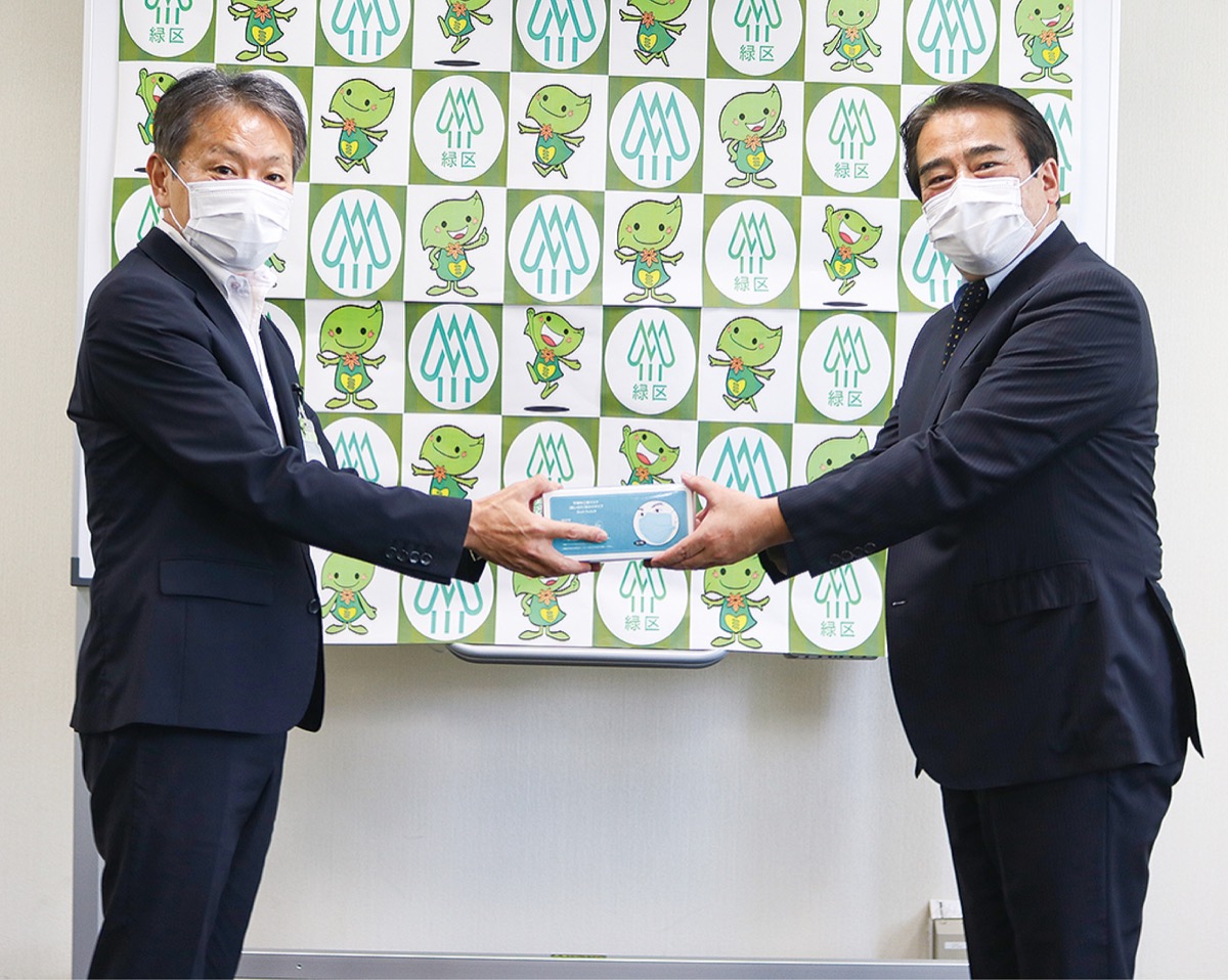 マスクは区内の高齢者向け施設で使われるという。池田社長は「高齢者や介護施設で働く人の安心、安全につながれば」と話した。また、岡田展生緑区長は「本当にありがたい。有効活用させて頂きます」と述べた。