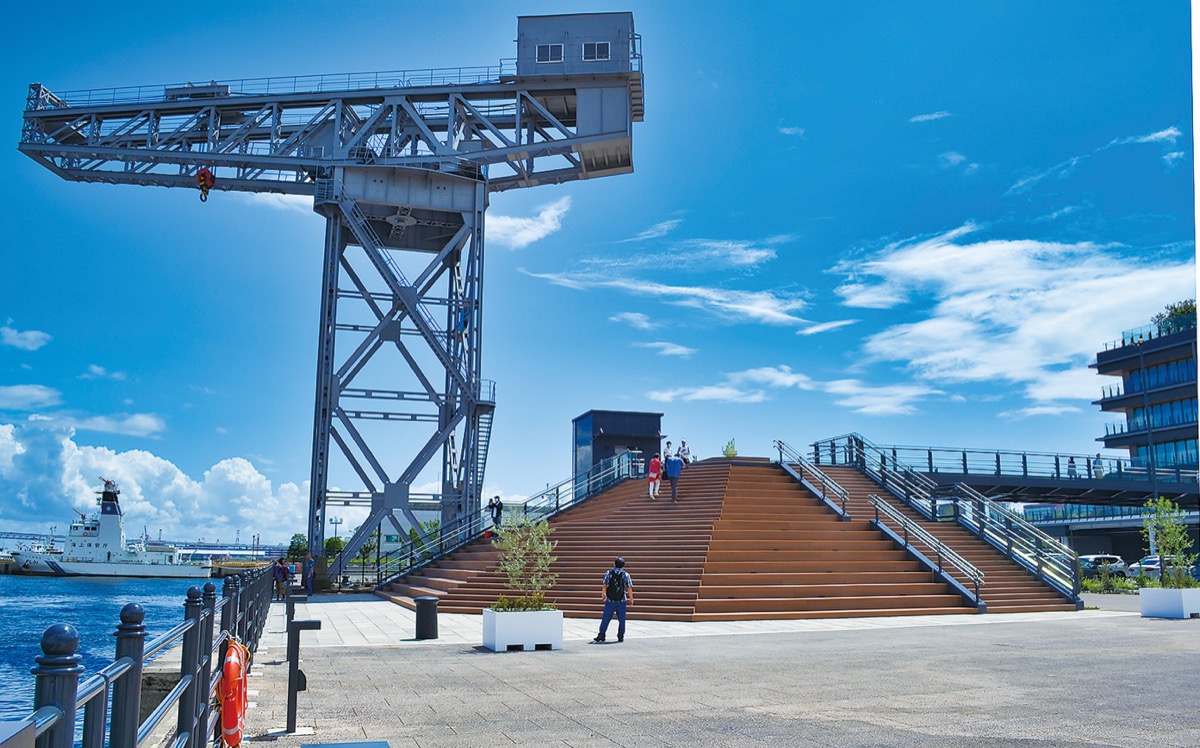 同所はクレーン・公園・デッキの3つからなる空間。クレーンは1914年の新港ふ頭整備に合わせて設置された日本初となる荷役専用のもの。2001年までの88年間貨物の積み下ろしに使われ、現在も稼働可能な状態で保存されている。近代化産業遺産や土木遺産にも認定されており、同地区のシンボル的な存在だ。