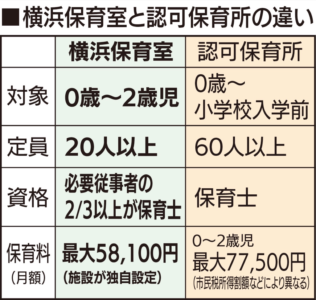 横浜保育室は、市の独自基準を満たし、市から認定を受け、経費の助成を受けながら運営する認可外保育施設。0〜2歳児が対象で、職員の中の保育士割合や園庭の広さなどが児童福祉法に定められた認可保育所より緩い条件になっている。