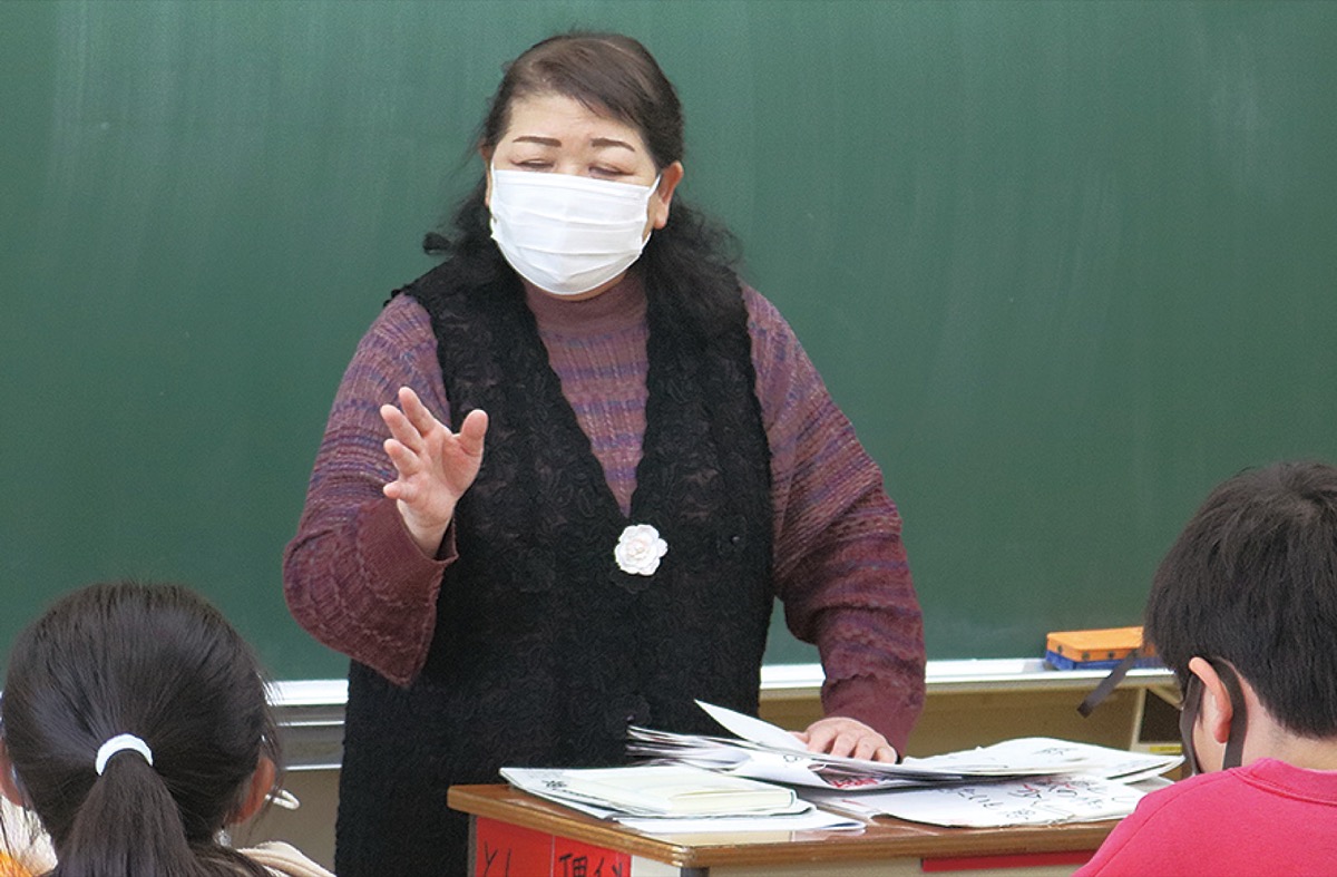 新治小学校で8日、卒業生の苅谷君代さん(62)が6年生に向けて授業を行った。