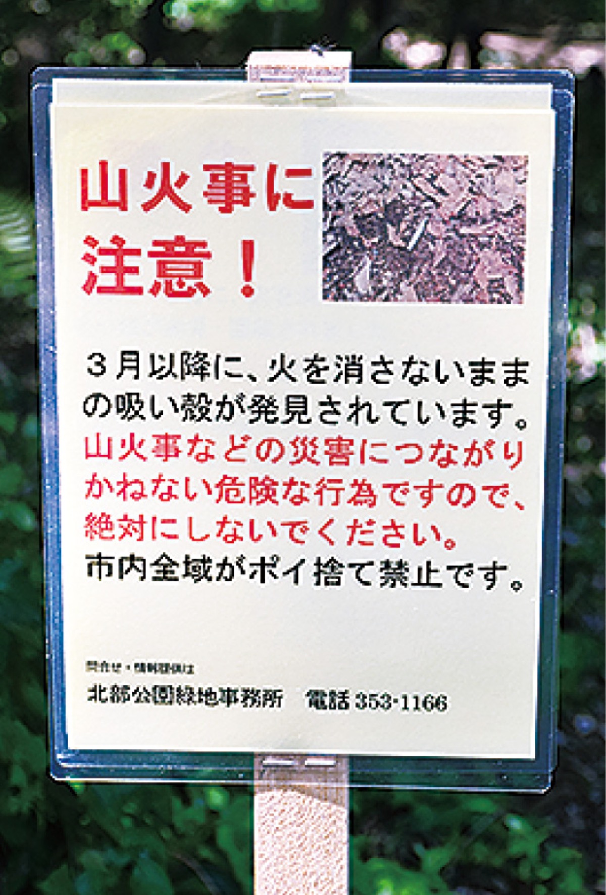 市民の憩いの場である同市民の森では、タバコの吸い殻やペットボトルなどのポイ捨てが確認されている。園路には「山火事に注意!」と書かれた看板を設置し、注意喚起を行っている。