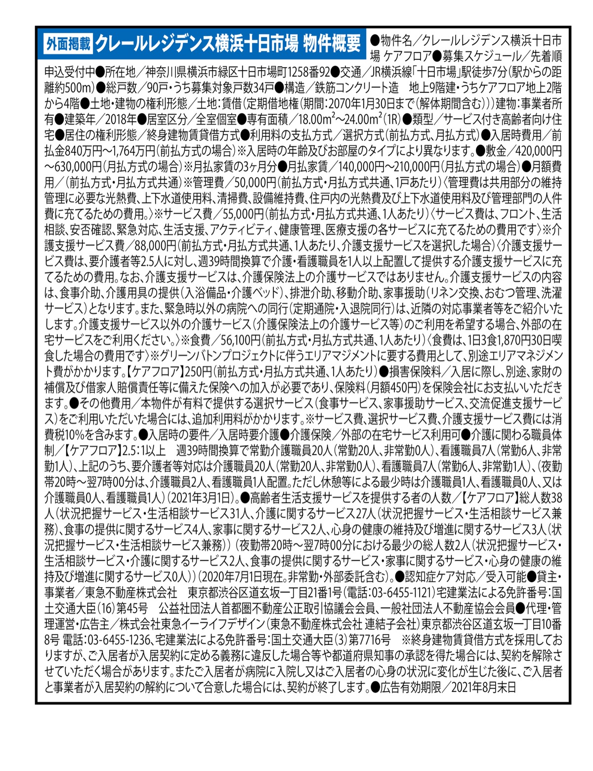 日常的に介護が必要な高齢者のための住まい「クレールレジデンス横浜十日市場・ケアフロア」で7月17日(土)と25日(日)、家族向けのセミナー付き見学会が各日5組限定で行われる。無料。