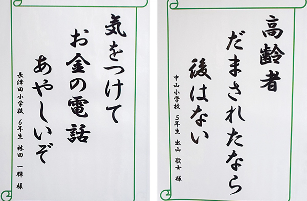 横浜みどりライオンズクラブ(杉崎孝一会長)は、クラブの50周年を記念した事業「防犯川柳」を実施しており、11月1日から8日までの期間で緑区役所1階エレベーター前の壁面スペースに入選作品52点を展示する。同クラブによると、区内の小中学校に応募を呼びかけ、児童・生徒からの応募は計311点だった。応募作品は50周年記念事業部会や選定委員会で選考を行ったという。選考の結果、52点が入選。その内の最優秀賞や優秀賞など22点の受賞者を11月に表彰する予定だ。