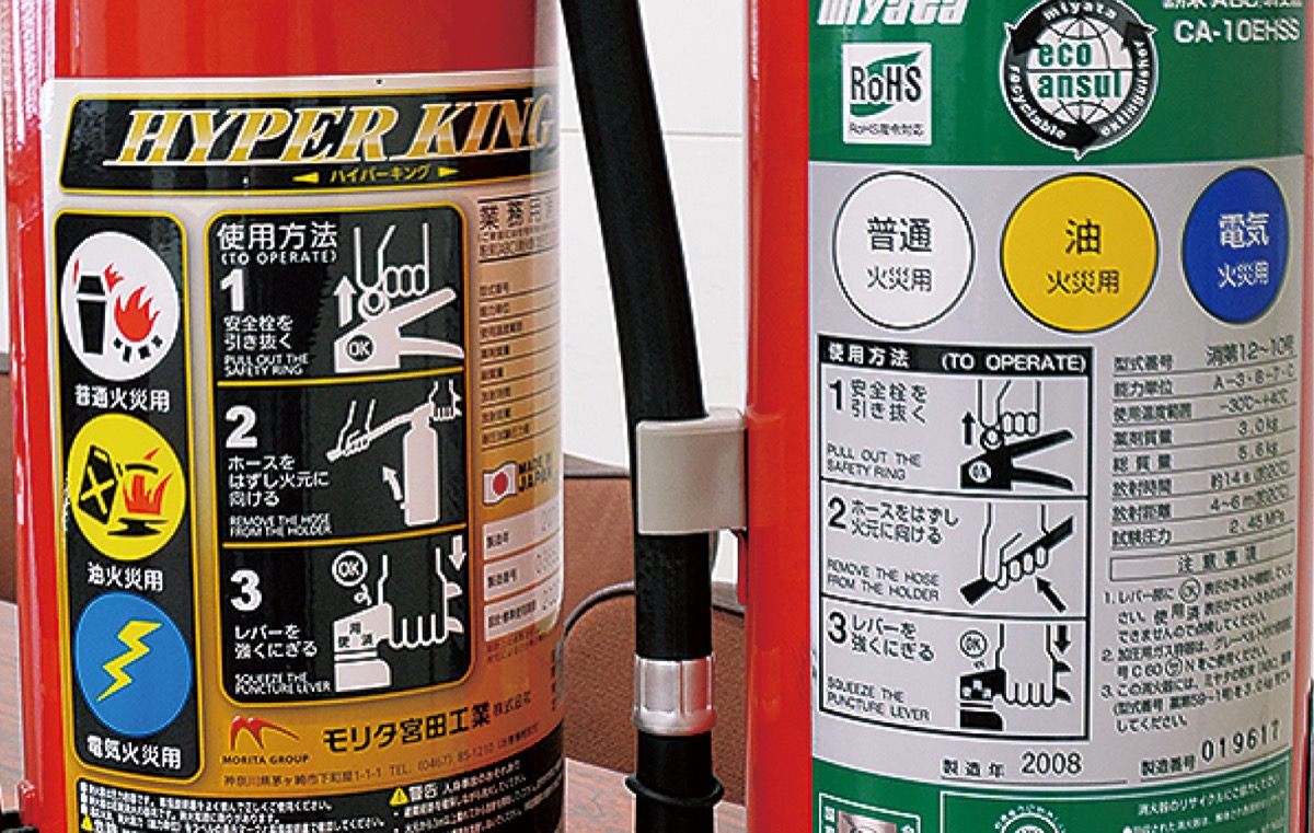 新規格には安全の観点から注意事項が細かく記載され、「普通火災用」「油火災用」などの適応火災マークを絵で表示。旧規格は文字表示のため、このマークが新旧を見分ける目印となる。
