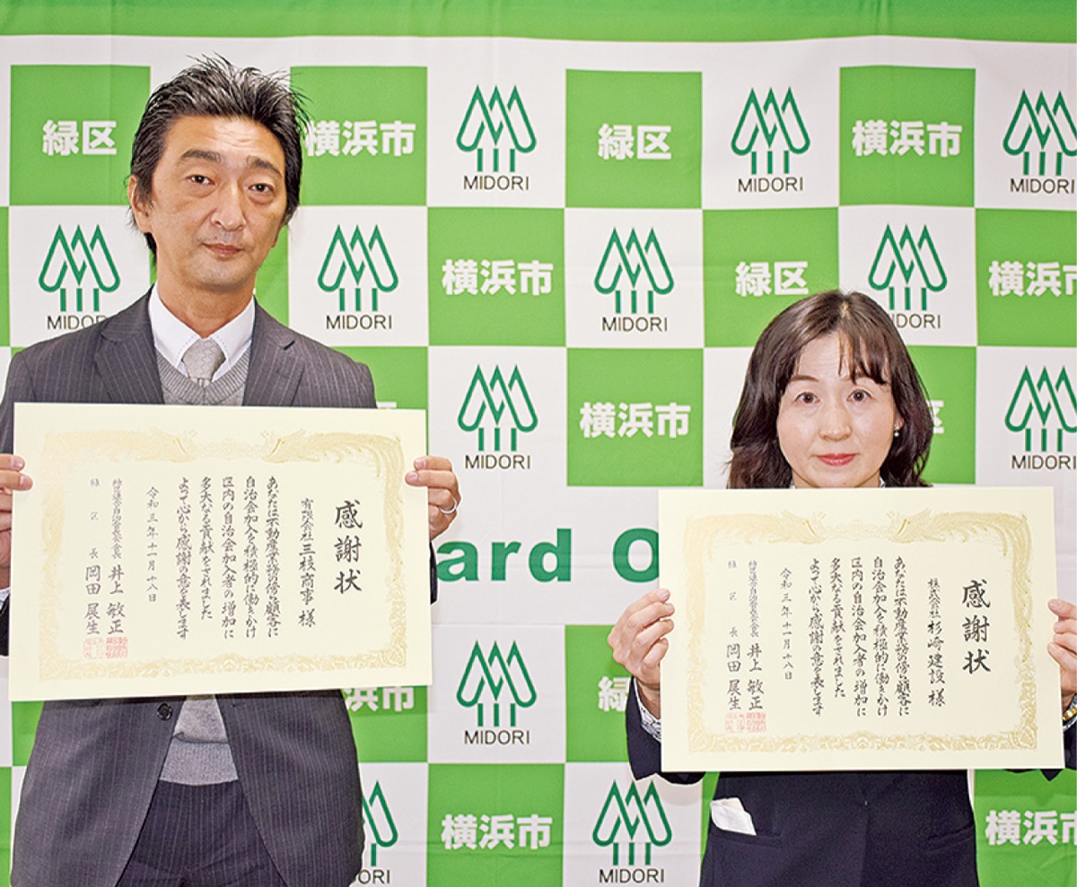 緑区役所は、年々低下する自治会加入率の改善を図ろうと、宅建協会に加盟する区内の不動産業者の窓口で、顧客に対してチラシを配布するなどの加入促進活動を依頼している。取組が始まって約半年。一定の効果があった2社に対して18日に感謝状を贈った。