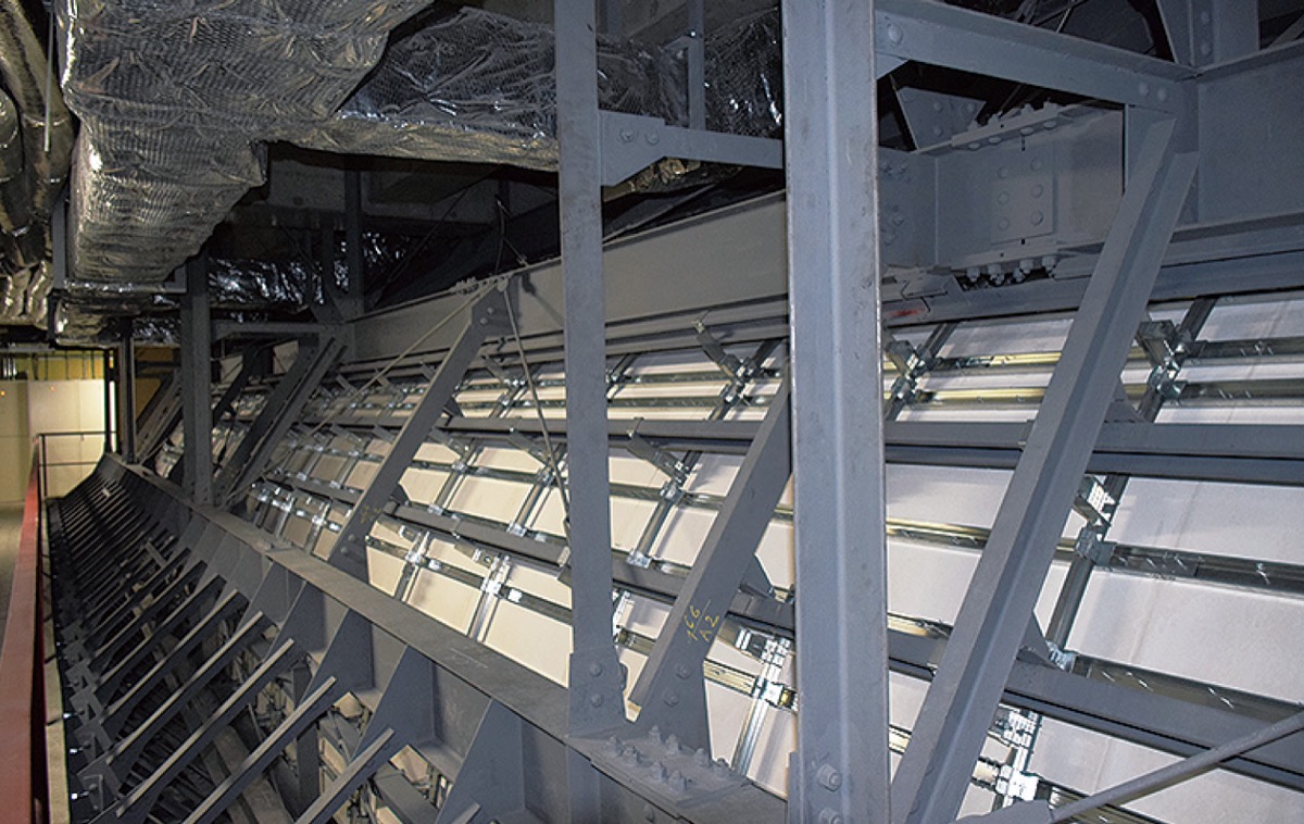 同計画を基に、同館の工事は昨年7月から9カ月に渡って行われた。当初契約額は建築工事と電気設備工事を合わせて約9820万円。ホール、ホワイエ、エントランスの天井裏に鉄骨を入れ、躯体と固定した。