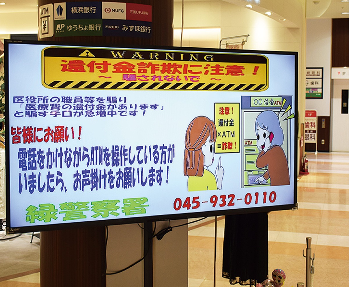 渡邊署長――特殊詐欺とは、被害者に電話をかけるなどして対面することなく信頼させ、指定した預貯金口座への振り込みを指示するなどの方法で不特定多数の者から現金などをだまし取る犯罪のことです。緑署は、区内の金融機関やATMを有するコンビニエンスストアと連携して▼窓口で多額の引き落とし▼高齢者による高額のプリペイドカード(電子マネー)購入――などがあった場合、対象者への声掛けや署への通報をお願いしていて多くの被害を阻止しています。また、このほどアピタ長津田店の店内にある電子看板で注意喚起を始めました。しかし、残念ながら今年に入っても被害はなくなりません。3月14日現在で14件(被害額約2000万円)発生しており、昨年同期比で10件増えています。犯人グループの手口は多様化しています。”検挙に勝る防犯なし”の精神で、今後も緑区民の大切な資産を守れるよう取り組みます。
