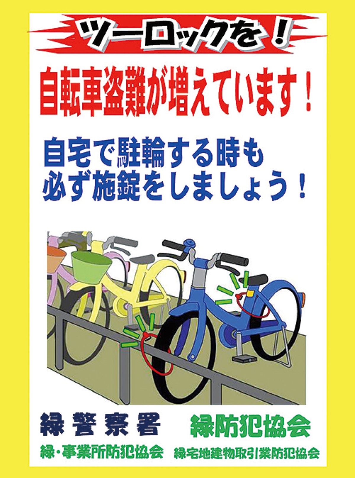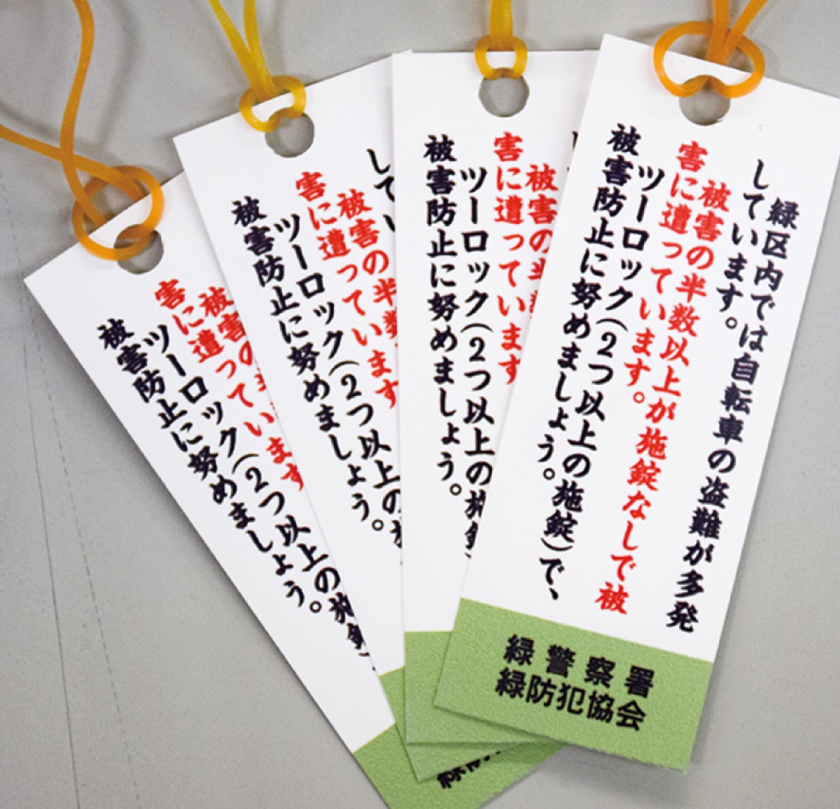 渡邊署長――そうなんです。「自動車盗」0件、「オートバイ盗」2件に対して「自転車盗」は既に15件発生しています(昨年同期比+2件)。詳細を見てみると、マンションやアパートなど集合住宅の駐輪場での被害が多いようです。また、施錠しているにも関わらず盗まれてしまったのが6件、無施錠が9件と半数以上が無施錠で被害に遭っているのです。敷地内だから…といった油断があるのかもしれませんが、盗まれた自転車が手元に戻って来ることはまずありません。ということは盗まれてからでは遅いので未然に防ぐことが重要です。対策として最も重要なのはやはり施錠すること。その上で、既存の鍵だけでなくワイヤー錠やU字ロックなど2重に鍵をかけるツーロックが効果的です。現在、区内の駐輪場に啓発ポスターを掲示しています。また、施錠をしていない自転車に注意喚起を行うことを目的とした札を作成しました。ツーロックを始めてみてください。