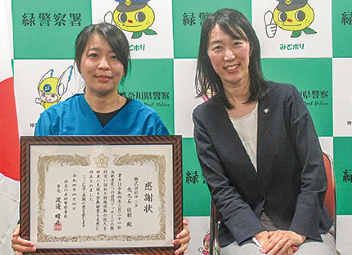 緑警察署(渡邊晴彦署長)は4日、特殊詐欺被害を未然に防いだとして、サニタ訪問マッサージ(鴨居3の40の7)で訪問マッサージの管理者として勤務する女性に対して感謝状を贈った。