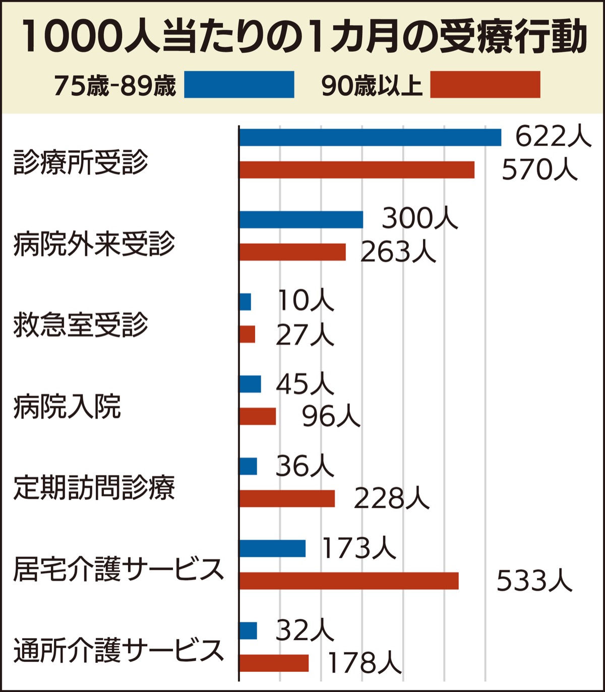 調査対象者は75歳以上の市内在住の45万4366人。診療所や病院の外来受診、救急室受診、病院入院、訪問診療、介護サービス利用などについて、1000人当たり・1カ月当たりに換算した人数を比較した。