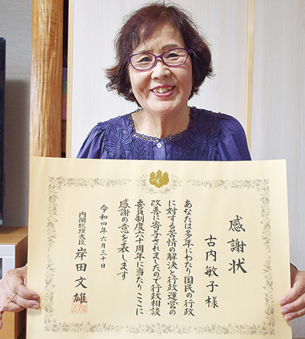 総務大臣から委嘱され身近な相談相手として、行政サービスに対する苦情のほか行政の仕組みや手続きなどの問い合わせに対応する行政相談委員として活動する古内敏子さん(中山在住)がこのほど、内閣総理大臣感謝状の表彰を受けた。