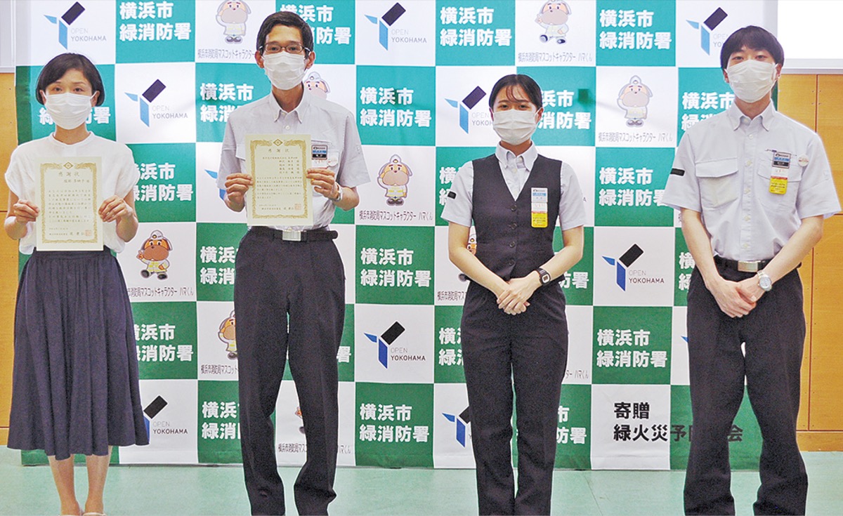 東急長津田駅構内で心肺停止状態の男性を冷静かつ的確な対応で救ったとして、緑消防署(堤康弘署長)は7月22日、服部多映子さん(44)と東急駅員の柳澤敏幸さん(53)、鴇田伸生さん(42)、藤島由香さん(24)、佐々木楓さん(22)に表彰状を贈った。