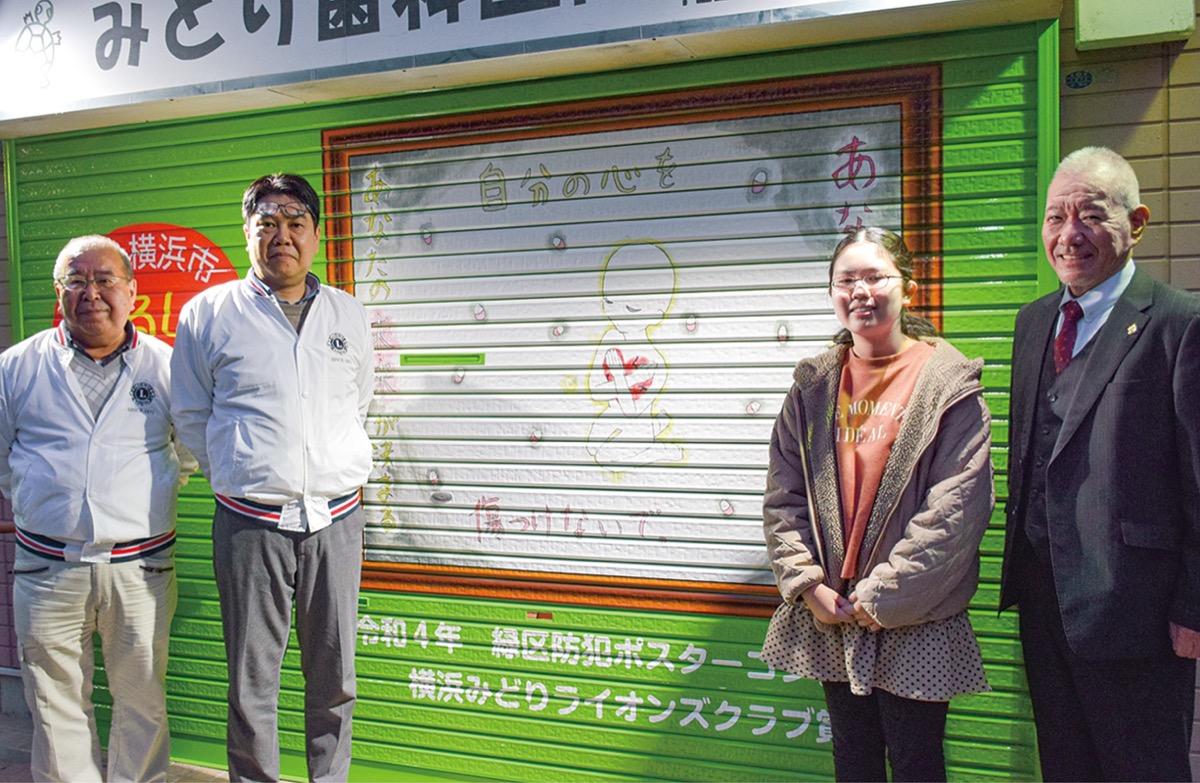 シャッターにデザインされているポスターは、同院の阿部院長が所属する横浜みどりライオンズクラブが緑防犯協会に協賛した「令和4年緑区防犯ポスターコンクール」で、同クラブ会長賞を受賞した奥田帆香さん(霧が丘学園小学部6年)の作品。
