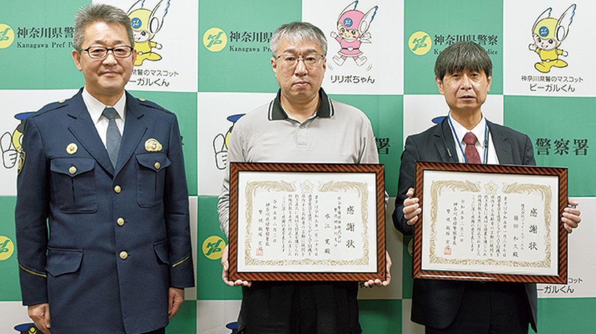 緑警察署(飯塚宏司署長)で2月3日、特殊詐欺を未然に防いだとして綜合警備保障(株)警送神奈川支社の水江寛さんと(株)ジェイ・エフ・エルの藤田和久さんに対して感謝状が贈られた。