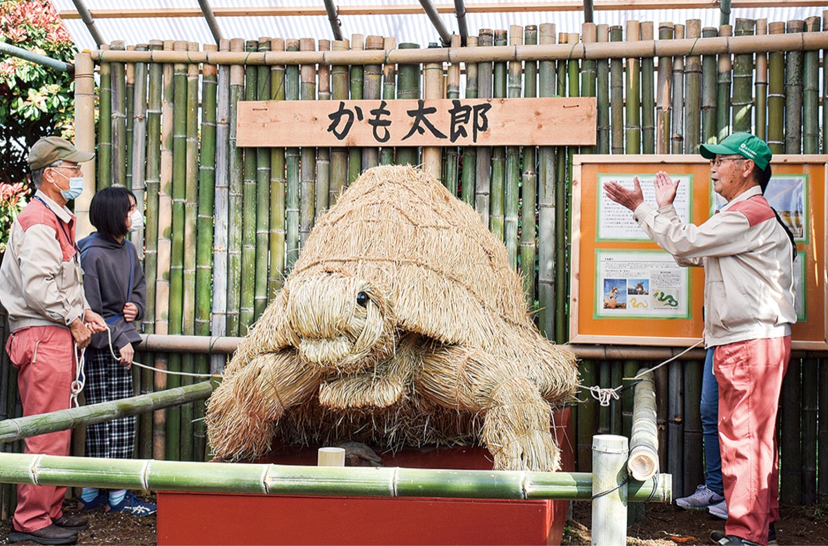 鴨居原市民の森内のハンカチの木広場で4月1日、同市民の森に展示されている藁で制作された亀の命名式が行われた。