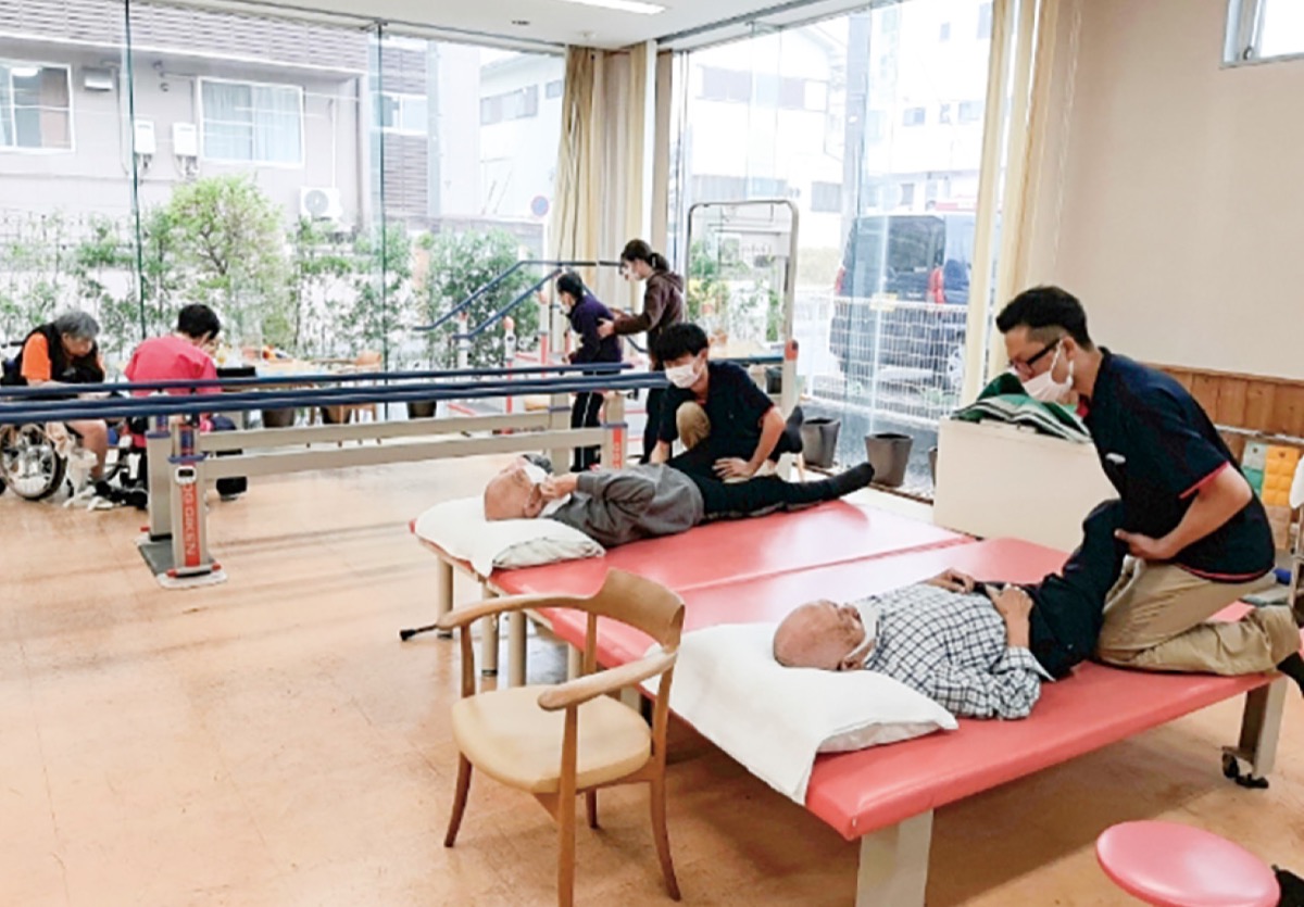 リハビリの専門職のほか、看護師、介護福祉士、ケアマネジャー、管理栄養士が在籍するおとなりさんは、「デイサービス」「訪問看護及びリハビリ」「ケアマネ事業所」を展開している。